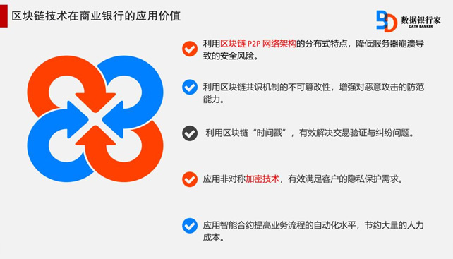 分布式数据存储、点对点传输、共识机制、加密算法等计算机技术的新型应用模式使得区块链技术银行业的应用方面存在巨大价值。